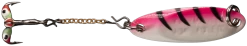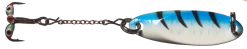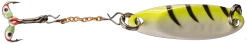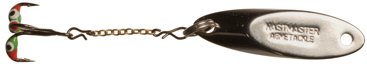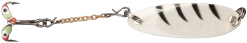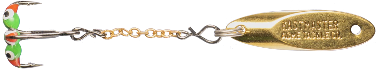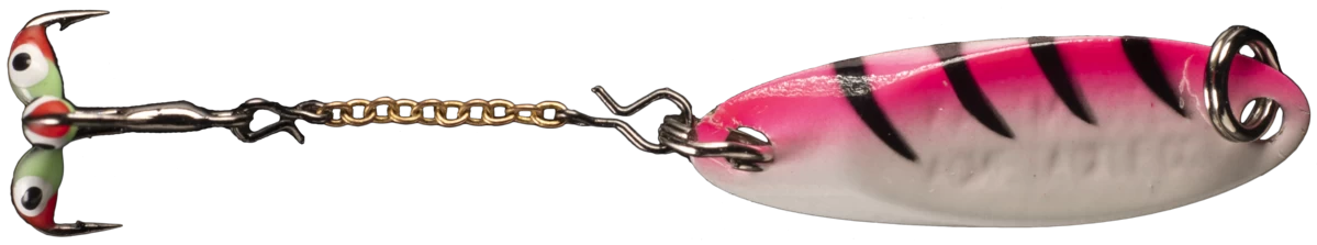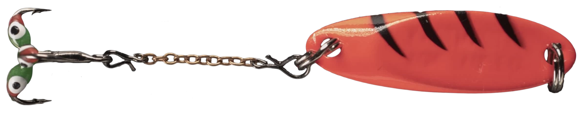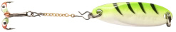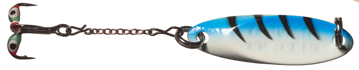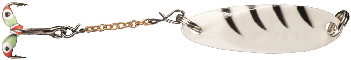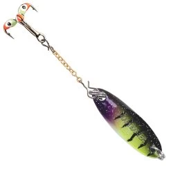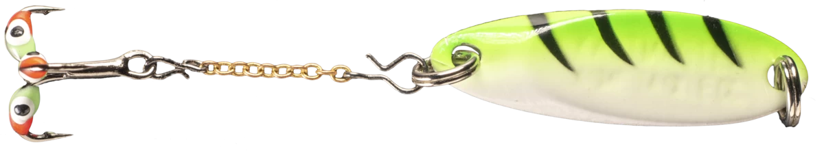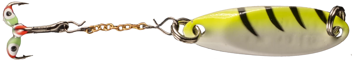 The attached drop-chain is great for adding live bait or meat chunks to the lure for irresistible attraction while ice fishing. The gold chain mimics flashing fish scales and the glow-bead trebles provide a target for the fish’s attention. The free-swivel action of the hook & chain increases hook-ups even on light bites!Â