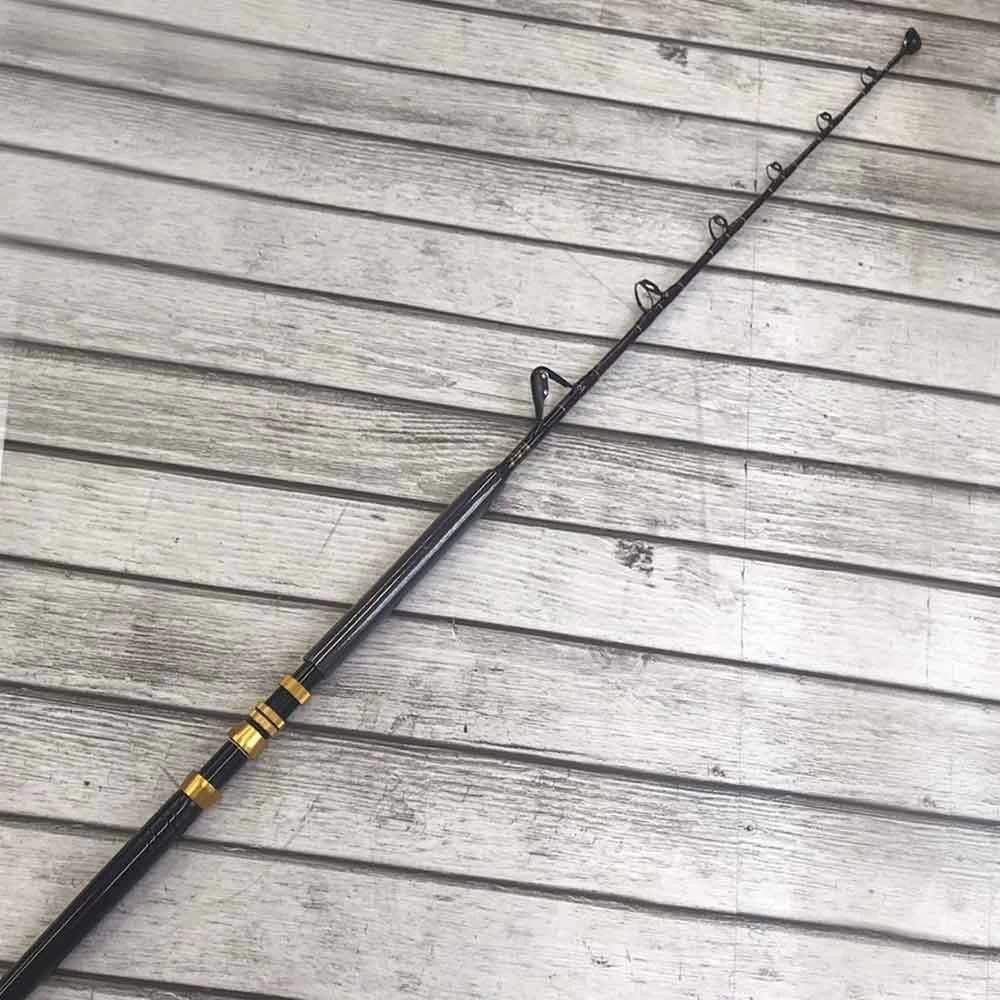 Aluminum butt and reel seat. Aftco Big Foot roller tip, ring guides and Aftco wind-on stripper guide for use with wind-on leaders. Class: 80 lb, Rod Length: 5’8″. C78-03590