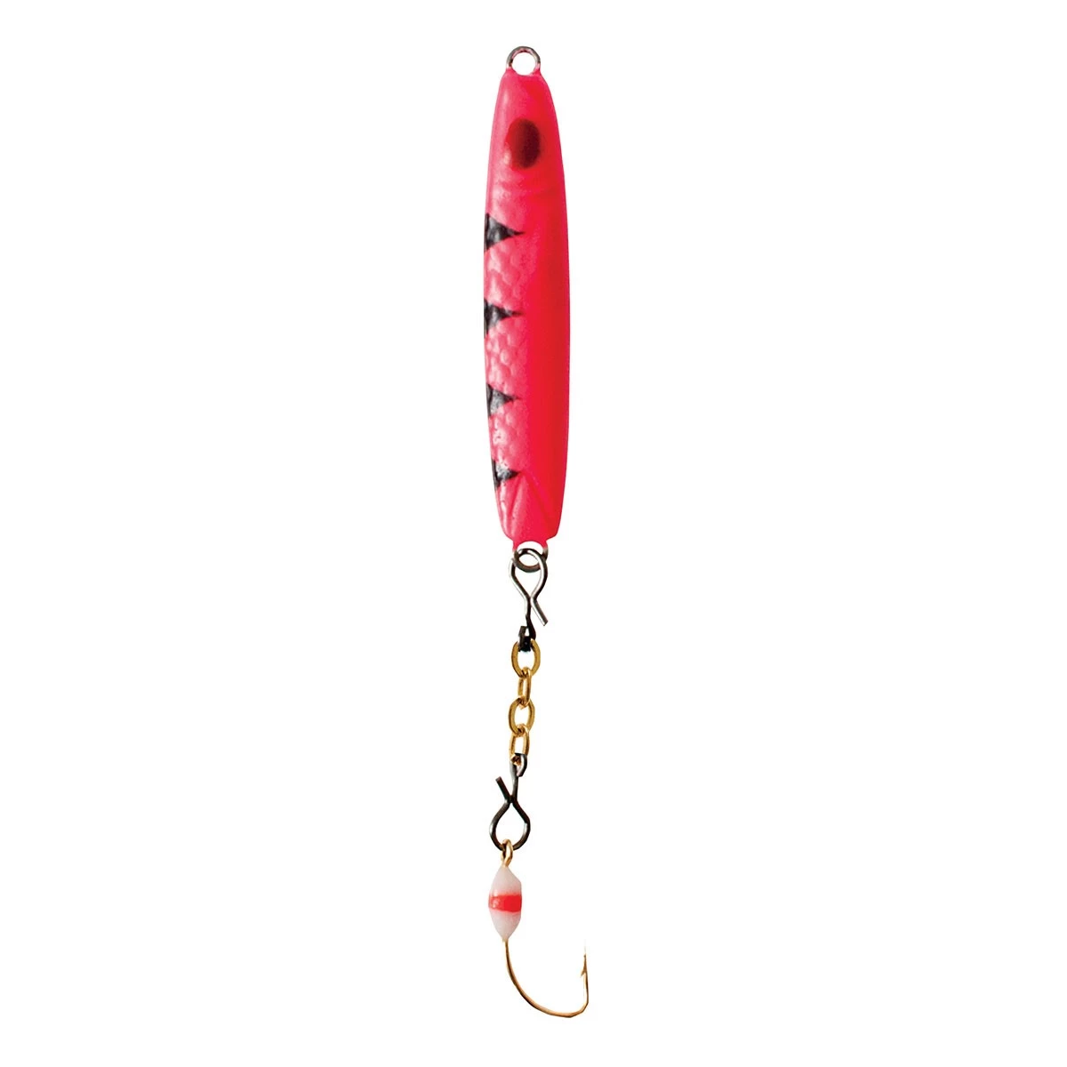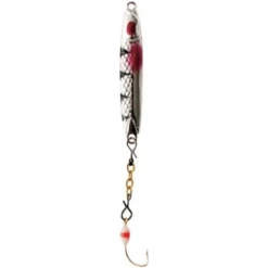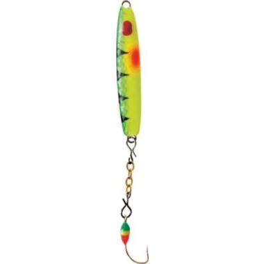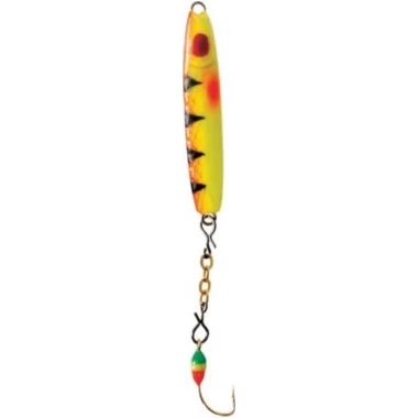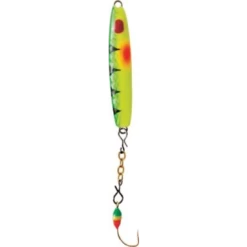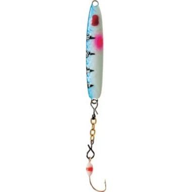 Attract fish with the Clam Pro Tackle Speed Spoon. The slim minnow profile reaches depths in record speed, grabbing the attention of heavily pressured fish. Lead spoon with dropper chain, colored glowing epoxy attractor hooks and irresistible paint pattern with dark and light belly draw in fish for success.