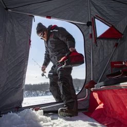 Why are you climbing over your holes and electronics to get inside your shelter? The Eskape 2600 has all of the benefits that you want with a side-door shelter, without any of the hassle of extra poles, detaching poles and difficult setup. No more tripping over your rod and electronics or stepping in your hole to get out of your shelter. Best of all, the Eskape 2600 was designed to fit under a tonneau cover in the back of most crew cab pickup trucks.