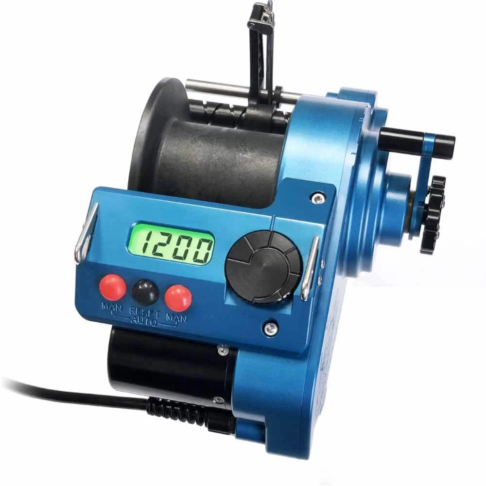 The LP Lindgren-Pitman Blue SV1200 Commercial Electric Reel is the first fully variable speed 12 volt electric reel from Lindgren Pitman . The SV-1200 is 25% faster on the highest speed setting compared to the LPS1200.. The SV-1200 provides 110lbs of pulling power at all speeds. Standard features are electronic clicker, built in adjustable level wind and a quick release hub.