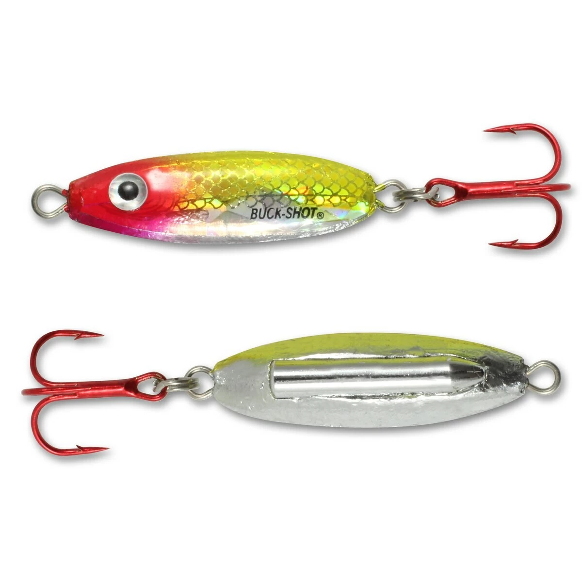The Buck-Shot® Rattle Spoon is deadly year-round for vertical jigging perch, walleye, trout, bass and pike. Jig aggressively in a lift-fall manner to call fish from a wide radius and make them strike. Tip with a minnow head, waxworms or IMPULSE Minnow Head and Perch Eye.