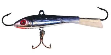 The most versatile and lethal jigging lure ever designed for vertical jigging below a boat or thru an ice hole. Tie one on and hang on. Lip-stick wide angle hooks. Allows anglers to change actions in seconds. Durable tail fin provides lifelike horizontal swimming action. Holographic bait-fish-image body.