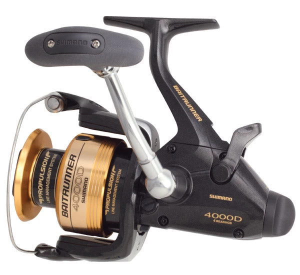The Shimano Baitrunner D combines today’s technology with legendary performance and durability. It features the Propulsion Line Management system: Propulsion spool lip, S-Arm Cam, SR one-piece bail wire, and Power roller III. Its also has 3 S A-RB (shielded A-RB) ball bearings. The new compact profile lineup of Baitrunners with their graphite frames and machined aluminum handles, can handle nearly any live-bait application from the new small 4000 size for freshwater and inshore species to the large 12000 size for bluewater.