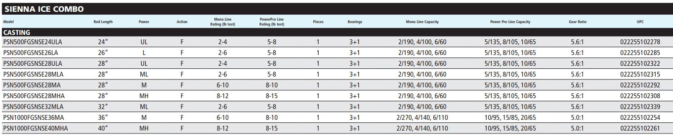 Reinvented for the modern age of ice fishing, the Sienna Ice Combo is offered in an arsenal of actions designed for all creatures that lurk below the ice. Sienna Ice rods now feature a new streamlined grip and a reel seat that reduces excess material to allow for better balance and a more comfortable grip, ultimately providing a lightweight rod with enhanced sensitivity. The EVA foam handle increases the rod’s durability to allow for years of fishing. The ultra-light and medium-light models of Sienna Ice feature an elongated hi-viz tip section for easier bite detection when fishing with light lures or jigs for panfish and walleye. These models also feature Aluminum Oxide guides as well as coil guides for decreased weight when fishing with lighter lines. Medium and medium-heavy models also feature Aluminum Oxide guides for increased durability when fighting larger fish. Available as a combo or as the rod by itself, the Sienna Ice is ready to challenge the elements.